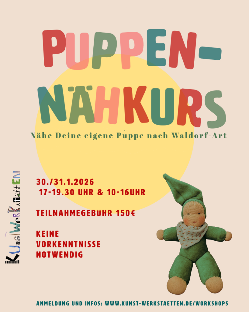 In diesem kreativen Puppenkurs lernst Du die Grundtechniken der Puppenherstellung nach Waldorfart – ganz ohne Vorkenntnisse. Wir arbeiten mit natürlichen Materialien wie Baumwolle und Wolle. An zwei Tagen gestalten wir gemeinsam ein Kose- oder Schlenkerpüppchen, das sich besonders für Kinder im Alter von 1 bis 3 Jahren eignet. Wenn Du die Grundlagen beispielsweise der Kopfherstellung sowie das Sticken eines einfachen Gesichts beherrschst, kann Du diese Techniken auf andere Puppenarten übertragen. Entdecke die Freude am handwerklichen Gestalten und schaffe ein einzigartiges Kuschelpuppen-Unikat mit Bedeutung und Herz.